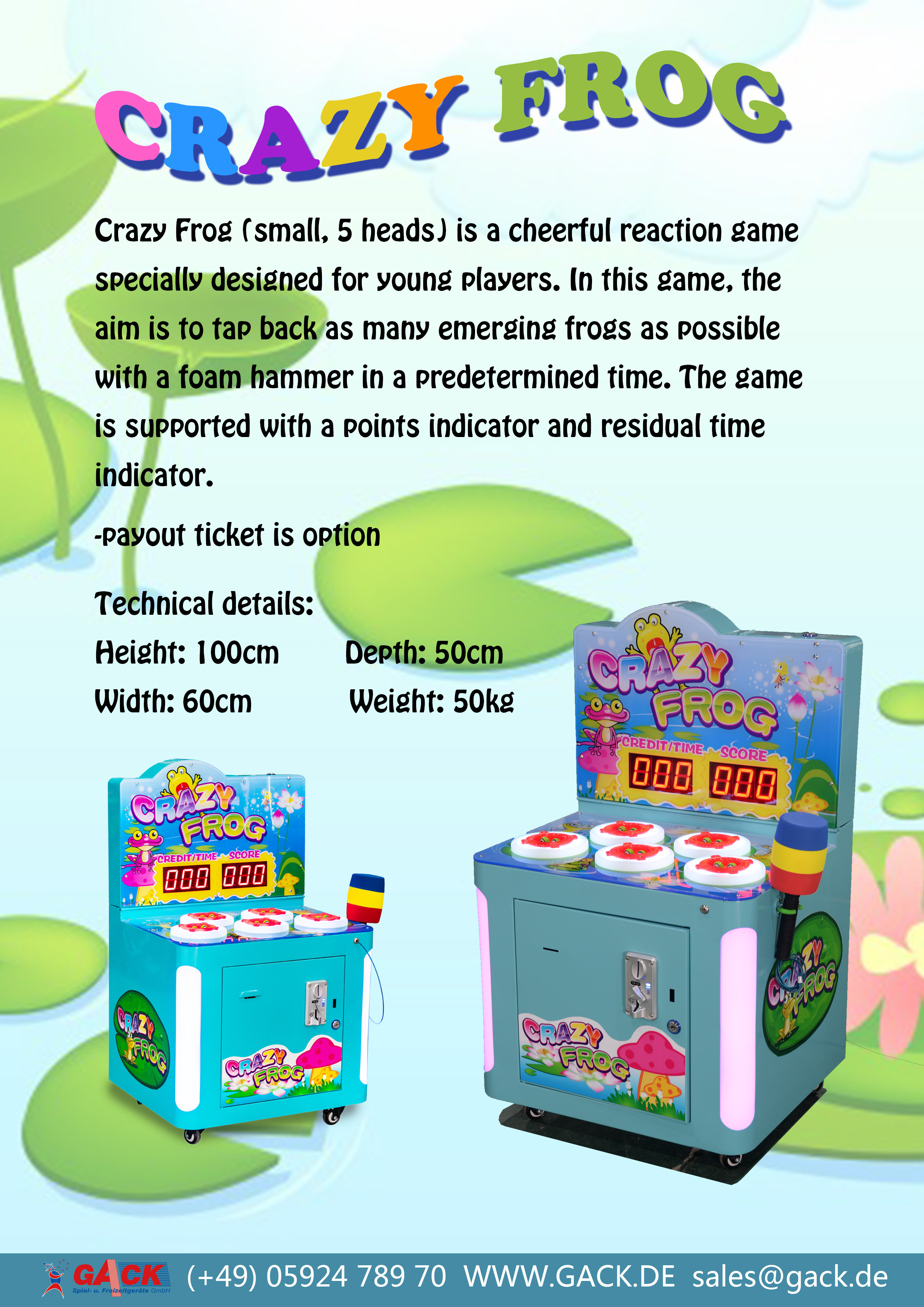 Crazy Frog (klein, 5 koppen) is een vrolijk reactiespel speciaal ontworpen voor jonge spelers. In dit spel is het de bedoeling om in een vooraf bepaalde tijd zoveel mogelijk opduikende kikkers met een schuimhamer terug te tikken. Het spel wordt met een puntenaanduiding en resttijdaanduiding ondersteund.